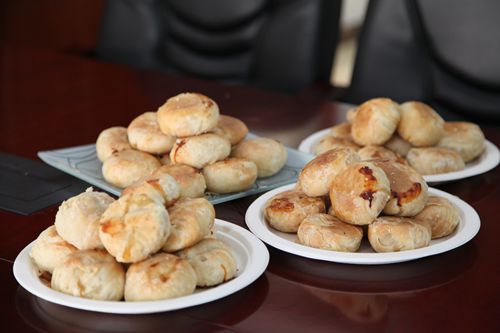 月饼的制作是一项繁重的工程,从配粉、发面、和面、起皮再到馅料包裹,成型,烤制,在财务部陈秀英陈姐的指导下,大家纷纷热火朝天的投入“生产流水线”中。陈姐告诉大家,在饼皮制作过程中除了面粉本身的比例很关键,上油过程也不容小视:配粉和面时上猪油,发完面,挤成小团之后上酥油,并且快速挤压成饼皮才能够保证饼皮的韧性。如果饼皮的韧性不够,包上馅子烤制时会裂开,导致馅子外漏。包肉馅的时候,大家为了能够吃上“实打实”的重量级月饼,纷纷把肉馅搓的又大又圆,刚裹上饼皮的月饼看上去就像是一只只肉包子。经过粗略整形,肥肥厚厚的月饼带着光滑的表面仿佛一个个憨厚的胖娃娃安安静静的躺在烤盘和烤架上。