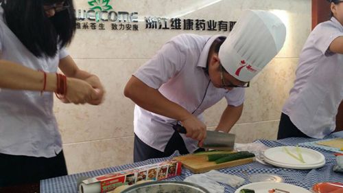 在大家和寿司不断“切磋”的过程中,一位寿司高手在男生中诞生了:OTC部的张琦运用娴熟的技能包出了米饭在外,蔬菜在内的反卷寿司,引得现场赞叹连连,现场获得“维康好男人”称号,不愧是真人不露相,露相非真人啊。