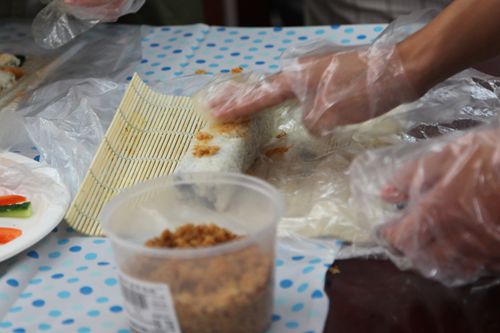 寿司的制作过程相对简单,把胡萝卜,盐水火腿,黄瓜等等要用的食材切成长条状,入盘备用。在小竹席上面铺上海苔,把浸过寿司醋的米饭平均铺满整张海苔,米饭不宜过多,会导致难以包裹以及口感不好,也不宜过少,米饭过少会导致难以黏合。米饭铺完整之后,在靠近自己的米饭层表面上横排列堆积适量的条状食材(胡萝卜条,黄瓜条,盐水火腿条各两根),之后在上面均匀的铺一层肉松。食材堆积完毕之后,网上淋适量的沙拉酱做粘合以及调味用。之后一点一点把食材卷入海苔中,一寸一卷一压紧,寿司卷就初步完成啦。卷寿司因为过程简单快捷更受大家的青睐,但是过程中还是难免有各种意外,常常会出现海苔破掉的窘境,于是切寿司的时候难免获得“意外的惊喜”。