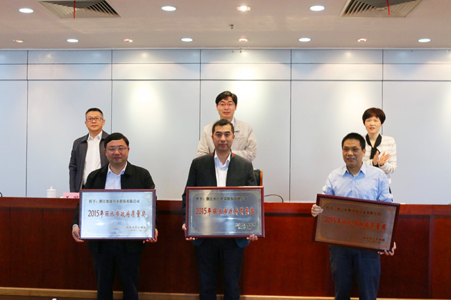 会上,丽水市人民政府副市长林亮、丽水市政协副主席卢彩柳、丽水市人民政府办公室副主任王国锋为获得2015年丽水市政府质量奖的企业和个人颁奖,卢卫芳副董事长代表公司上台领奖。