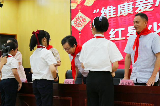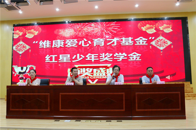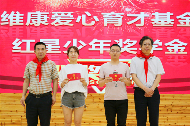 颁奖典礼上,在座领导和嘉宾为获得2019年度“维康爱心育才基金”红星少年奖学金的同学们颁发了奖学金,鼓励他们好好学习,天天向上。红星小学的少先队员代表向与会领导和嘉宾献上了鲜艳的红领巾,表达他们的喜悦与感谢。