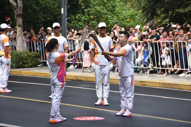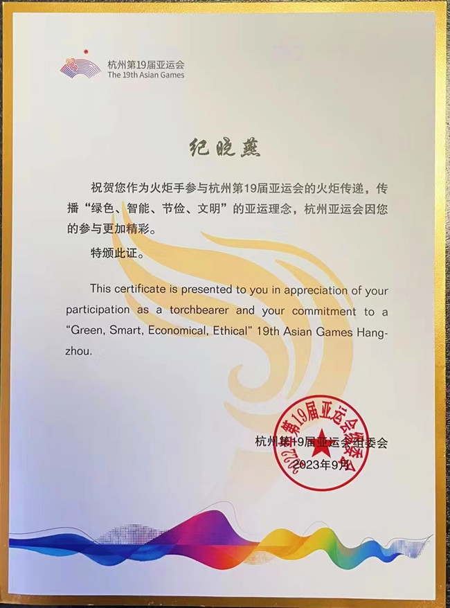 10点44分,纪晓燕作为杭州第19届亚运会火炬传递丽水站第132棒火炬手,接过熊熊燃烧的“薪火”,与上一棒火炬手传接后,将火炬高高举起,在热烈掌声和振奋呼声中以抖擞昂扬的姿态,阔步跑向下一个传递点,将饱含着体育精神和美好寄寓的火炬顺利交接到下一棒火炬手的手中,圆满完成了本次火炬传递。