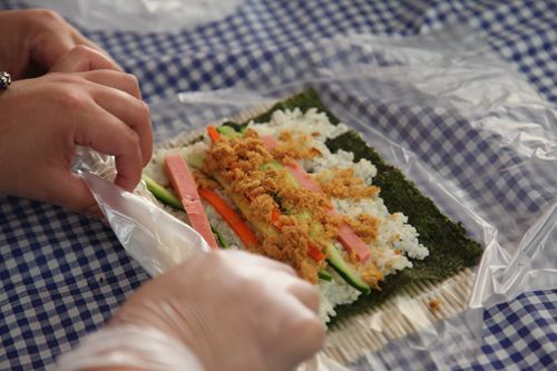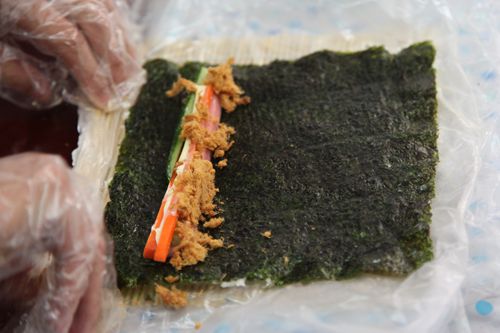 寿司的制作过程相对简单,把胡萝卜,盐水火腿,黄瓜等等要用的食材切成长条状,入盘备用。在小竹席上面铺上海苔,把浸过寿司醋的米饭平均铺满整张海苔,米饭不宜过多,会导致难以包裹以及口感不好,也不宜过少,米饭过少会导致难以黏合。米饭铺完整之后,在靠近自己的米饭层表面上横排列堆积适量的条状食材(胡萝卜条,黄瓜条,盐水火腿条各两根),之后在上面均匀的铺一层肉松。食材堆积完毕之后,网上淋适量的沙拉酱做粘合以及调味用。之后一点一点把食材卷入海苔中,一寸一卷一压紧,寿司卷就初步完成啦。卷寿司因为过程简单快捷更受大家的青睐,但是过程中还是难免有各种意外,常常会出现海苔破掉的窘境,于是切寿司的时候难免获得“意外的惊喜”。
