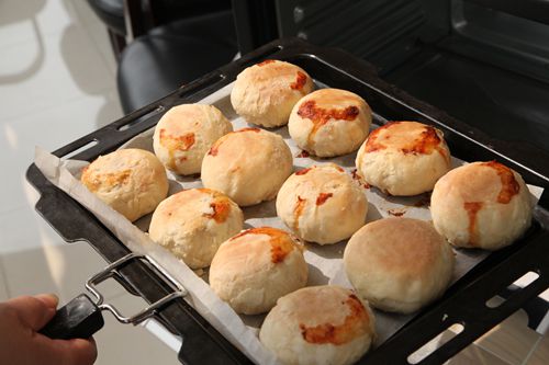 月饼的制作是一项繁重的工程,从配粉、发面、和面、起皮再到馅料包裹,成型,烤制,在财务部陈秀英陈姐的指导下,大家纷纷热火朝天的投入“生产流水线”中。陈姐告诉大家,在饼皮制作过程中除了面粉本身的比例很关键,上油过程也不容小视:配粉和面时上猪油,发完面,挤成小团之后上酥油,并且快速挤压成饼皮才能够保证饼皮的韧性。如果饼皮的韧性不够,包上馅子烤制时会裂开,导致馅子外漏。包肉馅的时候,大家为了能够吃上“实打实”的重量级月饼,纷纷把肉馅搓的又大又圆,刚裹上饼皮的月饼看上去就像是一只只肉包子。经过粗略整形,肥肥厚厚的月饼带着光滑的表面仿佛一个个憨厚的胖娃娃安安静静的躺在烤盘和烤架上。