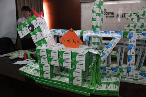 在产品堆头竞赛中,每个部门自成一队,利用公司产品银黄滴丸、人参健脾片、枫蓼肠胃康分散片等样盒,展开集灵感、智慧与手艺为一体的堆头大比拼。经过前期的齐心协力,参与的团队共完成了七个药品堆头,主要包括市场部的“龙舟”,维康大药房的“年年有余”、“G20”,商务部的“马到成功”,信息部的“维康大厦”等,为大家带来了各种惊喜和精彩的视觉感受。