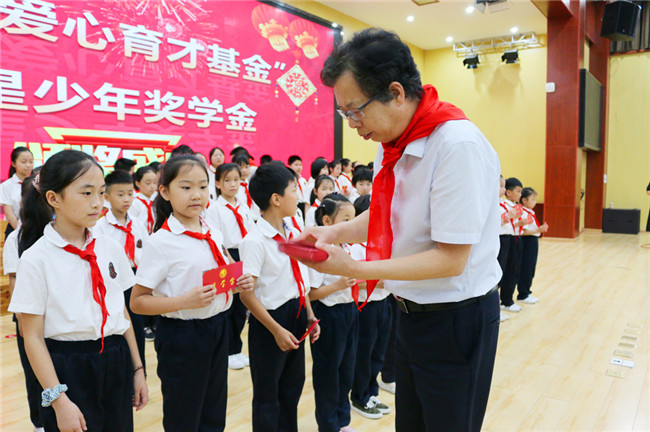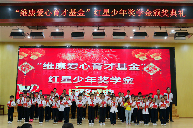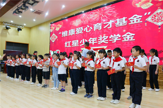 颁奖典礼上,在座领导和嘉宾为获得2019年度“维康爱心育才基金”红星少年奖学金的同学们颁发了奖学金,鼓励他们好好学习,天天向上。红星小学的少先队员代表向与会领导和嘉宾献上了鲜艳的红领巾,表达他们的喜悦与感谢。