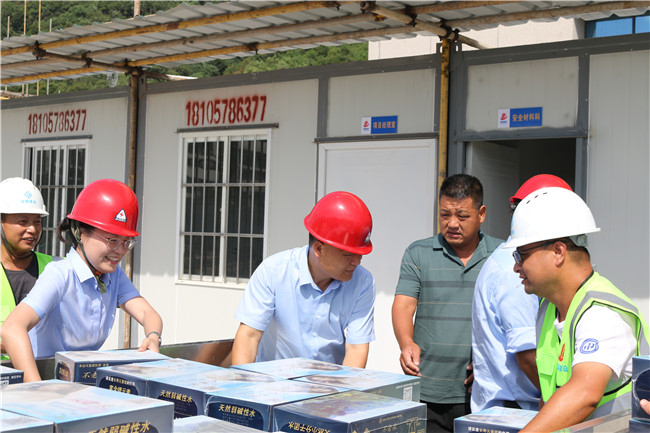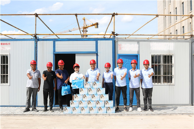 7月20日下午,开云体育平台官方网站-开云体育(中国) 执行总裁吴建明,党委副书记、董事会秘书朱婷,项目总监金炳武等慰问组一行来到项目工程现场,代表公司向奋战在一线的建筑工人传达关心和慰问,为他们在公司项目建设中作出的贡献表示敬意和感谢,并为建筑工人们送上银黄滴丸、藿香正气水、仁丹、清凉油、矿泉水等消暑降温物资,把清凉送到施工一线,把关怀送到工人心坎。