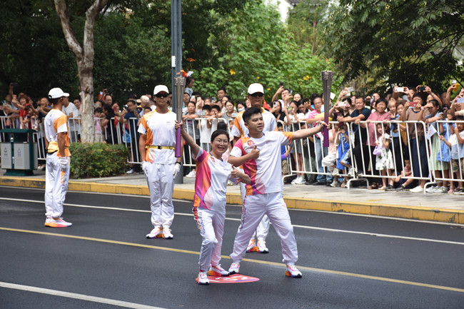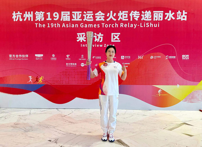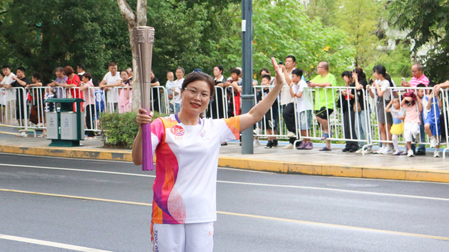10点44分,纪晓燕作为杭州第19届亚运会火炬传递丽水站第132棒火炬手,接过熊熊燃烧的“薪火”,与上一棒火炬手传接后,将火炬高高举起,在热烈掌声和振奋呼声中以抖擞昂扬的姿态,阔步跑向下一个传递点,将饱含着体育精神和美好寄寓的火炬顺利交接到下一棒火炬手的手中,圆满完成了本次火炬传递。
