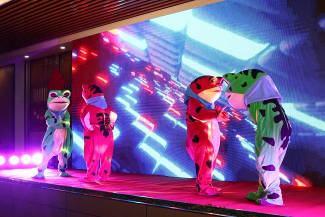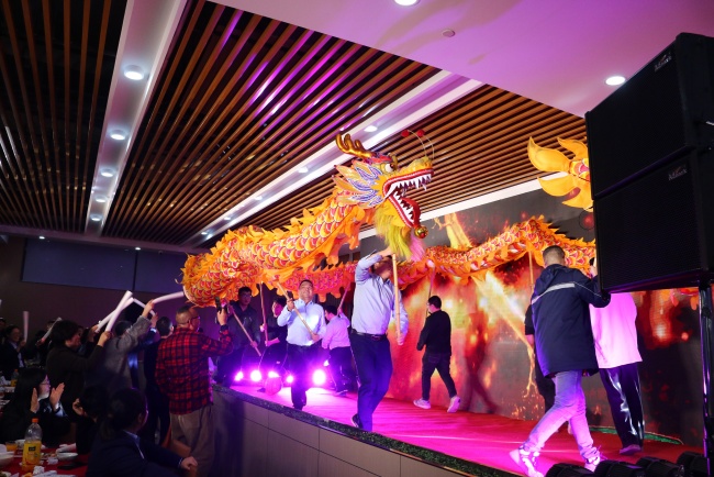 随后歌曲、舞蹈、贝斯弹奏等10余个由维康员工自编自导自演的节目轮番上演。生产部选送的歌曲《我的中国心》慷慨激昂,激发全场中华儿女的壮志豪情;研发部选送的合唱《奔跑》鼓舞着每个维康人坚定信念,勇敢向前奔跑;物控部金鑫带来贝斯演奏《潮汐》,轻柔舒缓,优美动听;项目部的合唱《中国人》激情豪迈、气势恢宏;财务部的街舞表演节奏分明、别出心裁;制造二部三车间肖艳一首《青藏高原》飚出超高音,技惊四座,将晚会推向新高潮;制造二部二车间雷和珍身着马面裙带来独唱《大中国》,深情演绎爱国之情与文化自信;行政部化身“可爱蛙”激情演绎舞蹈《护花使者》,活力四射,“笑”果十足;由工程部、信息部、行政部联合选送的压轴节目舞龙表演《龙年大吉》更是引爆全场,飞舞的巨龙时而腾起,时而俯冲,蜿蜒翻腾,活灵活现,迎接即将到来的新春佳节。
